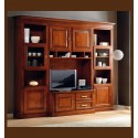 Spațiile deschise alternează cu spațiile închise într-o armonie perfectă. Central, nișa pentru televizor este încadrată frumos de părțile laterale alcătuite simetric din două dulapuri, două vitrine și patru rafturi de dimensiuni generoase. Deasupra nișei, sub dulapul cu uși duble există o serie de rafturi mici care îndulcesc sentimentul de austeritate dat de o mobilă masivă, la fel ca și alternarea dulapului, cu rafturi, de la bază. Liniile clasice sunt și ele atent urmărite prin forma cornișei și a soclului, prin culoarea și forma componentelor, iar ușile frumos sculptate, cu feronerie antichizată dau eleganță întregului.